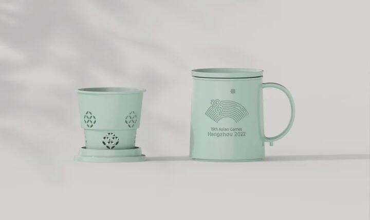 另外两件作品,青玉杯将杭州亚运会吉祥物与西湖水融进了历史悠久的越窑青瓷,茶杯线条明快流畅,握柄自然,整体清新脱俗。茶滤孔大小方向科学合理,造型呈现天圆地方,新颖典雅,釉色润泽饱满、似玉类冰。