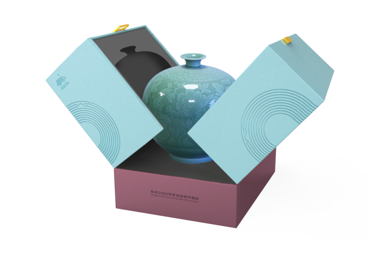 越瓷牡丹瓶则采用越窑青瓷中古老的剔花工艺高温烧制而成,青色的底色象征着亚运会的青春与活力,也表达对亚运盛事长青不衰的祝福;牡丹花凸显于器物表面,缠枝交错,花朵争相绽放,寓意亚运会的热烈空前;上下两组开片的纹路,犹如碎石有序陈列,有“石破惊天”之意,希望亚运健儿们能取得惊人的成绩。整个器型的造型是“石榴”的造型,圆润饱满,彰显端庄大气。