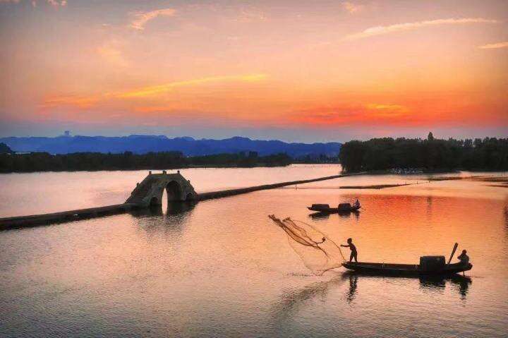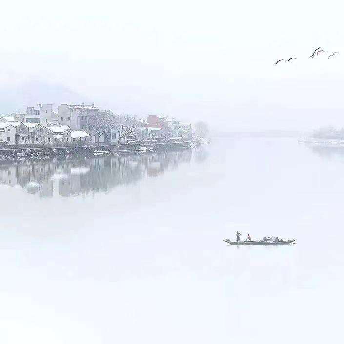 这首熟悉的诗,像一个江南梦,也像一幅徐徐铺开的水乡画卷:白云悠然,碧波缓缓,桥梁的倒影潋滟在水波中,船只在桥下自由地穿梭往返,欸乃声浓……