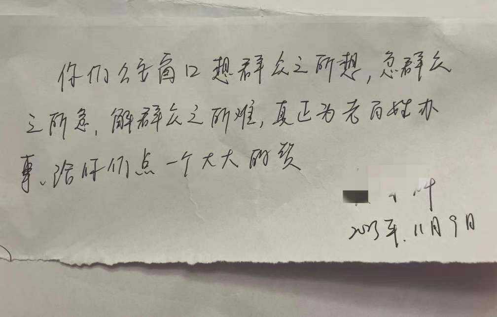 核实真相后,黄煜波很快为潘先生关于身份证号“重号”的营业执照问题进行了证明与更正。潘先生发现自己的难题这么快就解决了,心里特别开心,一个劲说着谢谢,手里用笔写了一张小纸条。待走后,黄煜波拿起留下的纸条仔细一看,字里行间充满感激。