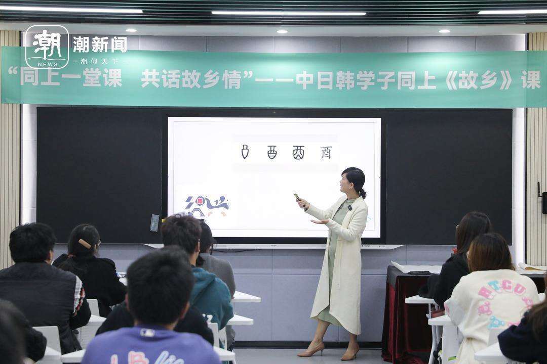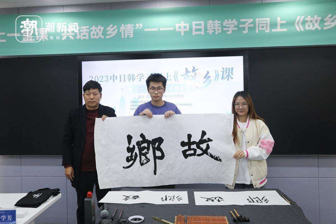 同上一堂课,共话故乡情。11月29日,2023“中日韩同上一堂课”活动在浙江越秀外国语学院、日本城西国际大学、韩国水原大学同步进行,课堂采用线上直播互动,打破时空限制,让中日韩学生在所在地也能同上一堂中国《故乡》课。课堂还设置了形式多样的云互动,让身处不同地方的中日韩学子实现了线上“面对面”的沟通交流。在“赞美我的故乡”环节上,中日韩学子分享其故乡的美食美景;而在书法互动环节上,中日韩学子与书法家喻革良老师同写“故乡”二字。
