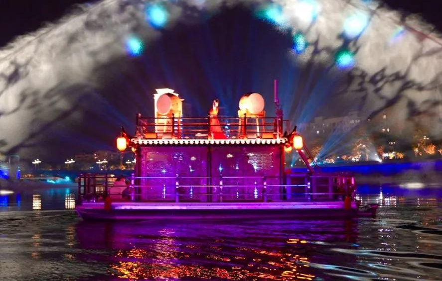 按照“410行动”的总体目标,“浣江夜游”项目将城市中山、湖、河等自然景观作为城市夜景本底,构建“古城夜色、水城夜感、新城夜貌” 梦幻般的城市景观亮化体系,打造“如梦如幻”的城市夜景。《遇见西施》就是以诸暨最为人熟知的传奇美人——西施的故事为主线,共分为《溯源暨》《西遇暨》《知音暨》《青春暨》《归来暨》五大篇章,巧妙地结合戏剧、电影手法,将真人演出与视觉艺术、水景特效、装置艺术融为一体。游客坐在游船上,就可以看到水上舞台实景演出,还可以欣赏绳幕、水幕、时空隧道、喷泉的科幻。