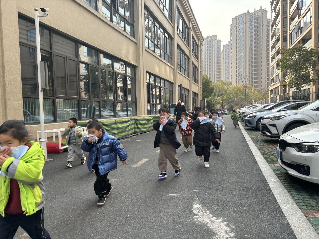 活动中,学生们在老师的指导下用湿毛巾捂住口鼻,有序“逃生”,掌握了更多自我保护的方法。