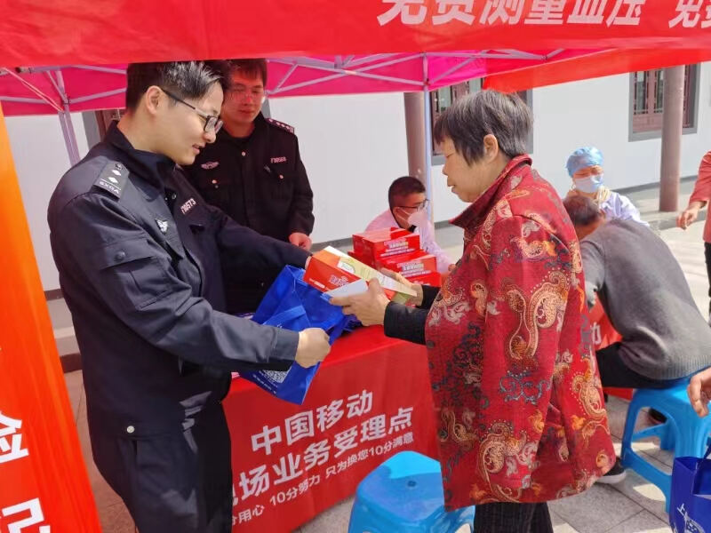 在道墟街道屯南村,一大早,党员志愿者就通过移动公司的村社现场服务点,向前来量血压的居民发放宣传资料,并用现场答疑与案例分享的形式,让市民学到如何甄别网络谣言、如何防范电信网络诈骗的相关知识。现场群众积极参与互动,在轻松的氛围中学到了反诈知识。