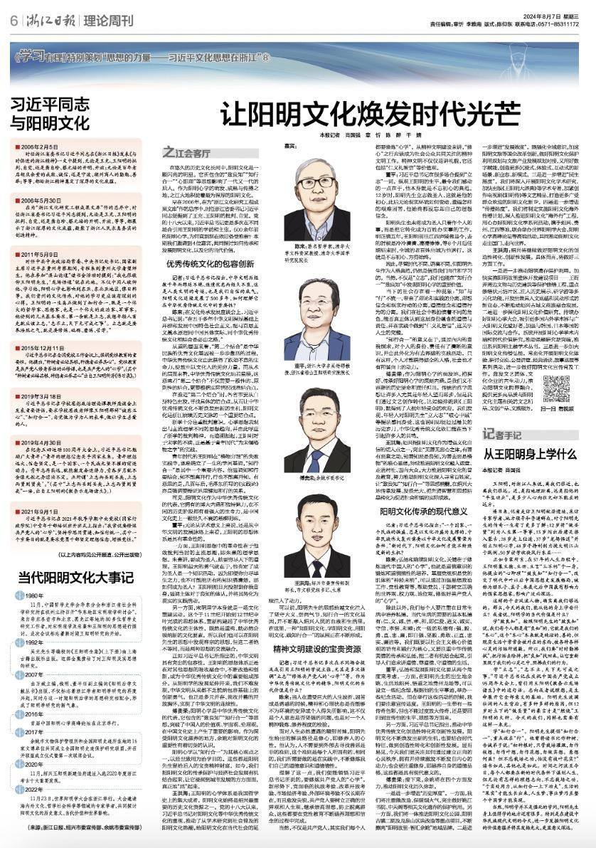 党的十八大以来,习近平总书记多次在不同场合引用王阳明的学说和主张。500余年前的阳明心学,为何直到现在依旧备受推崇?本期我们邀请到4位嘉宾,共同探讨如何传承和发展阳明文化,以及它的当代价值。今日出版的浙江日报理论周刊对此进行了报道。