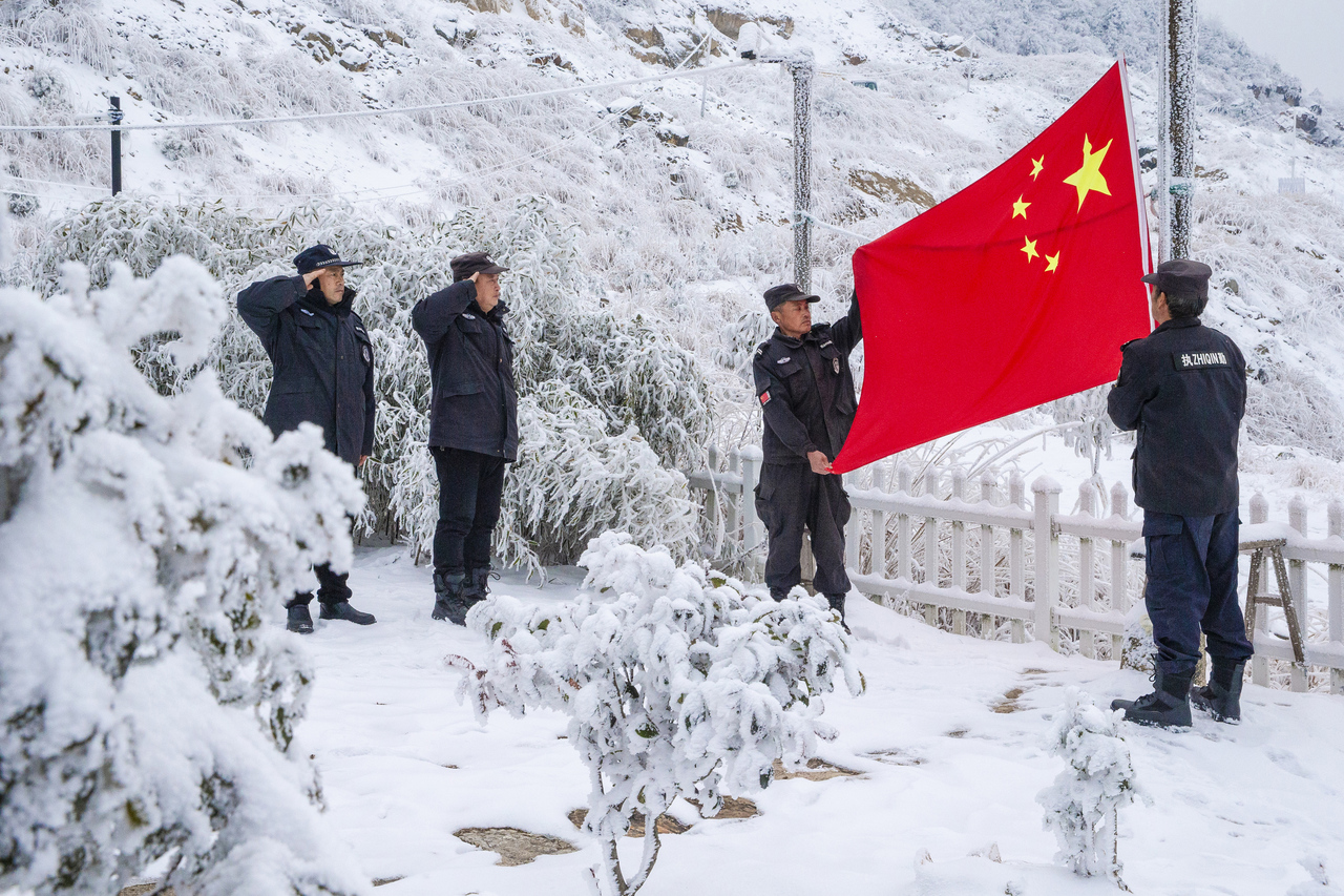 01、2026年1月21日,每日清晨.6时,将五星国旗齐齐升起,飘扬在云上警务室上空,与山相依,警员们与责任同在。