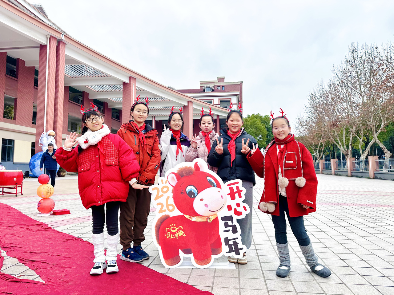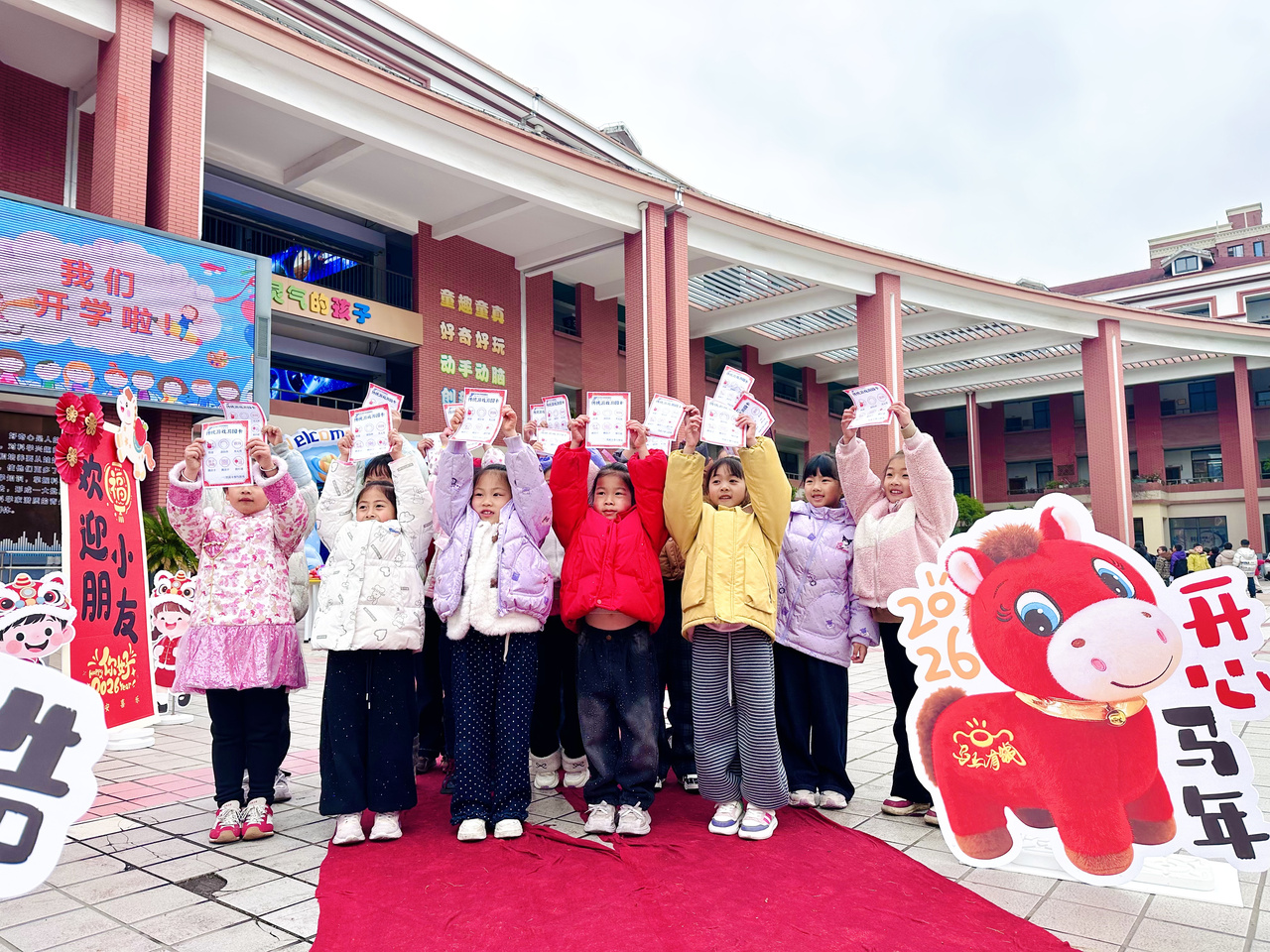 踏入校园,浓浓的迎新氛围扑面而来,“小马迎新,暖心启航” 环节率先为孩子们送上开学惊喜。校前广场上,科技感十足的迎新布置相映成趣,大鼓、苹果、橘子、大葱整齐摆放,蕴藏着 “一鼓作气、平平安安、大吉大利、聪明伶俐” 的美好祝福,孩子们穿梭其间,触摸吉祥物件,在仪式感中迈好新学期第一步。
