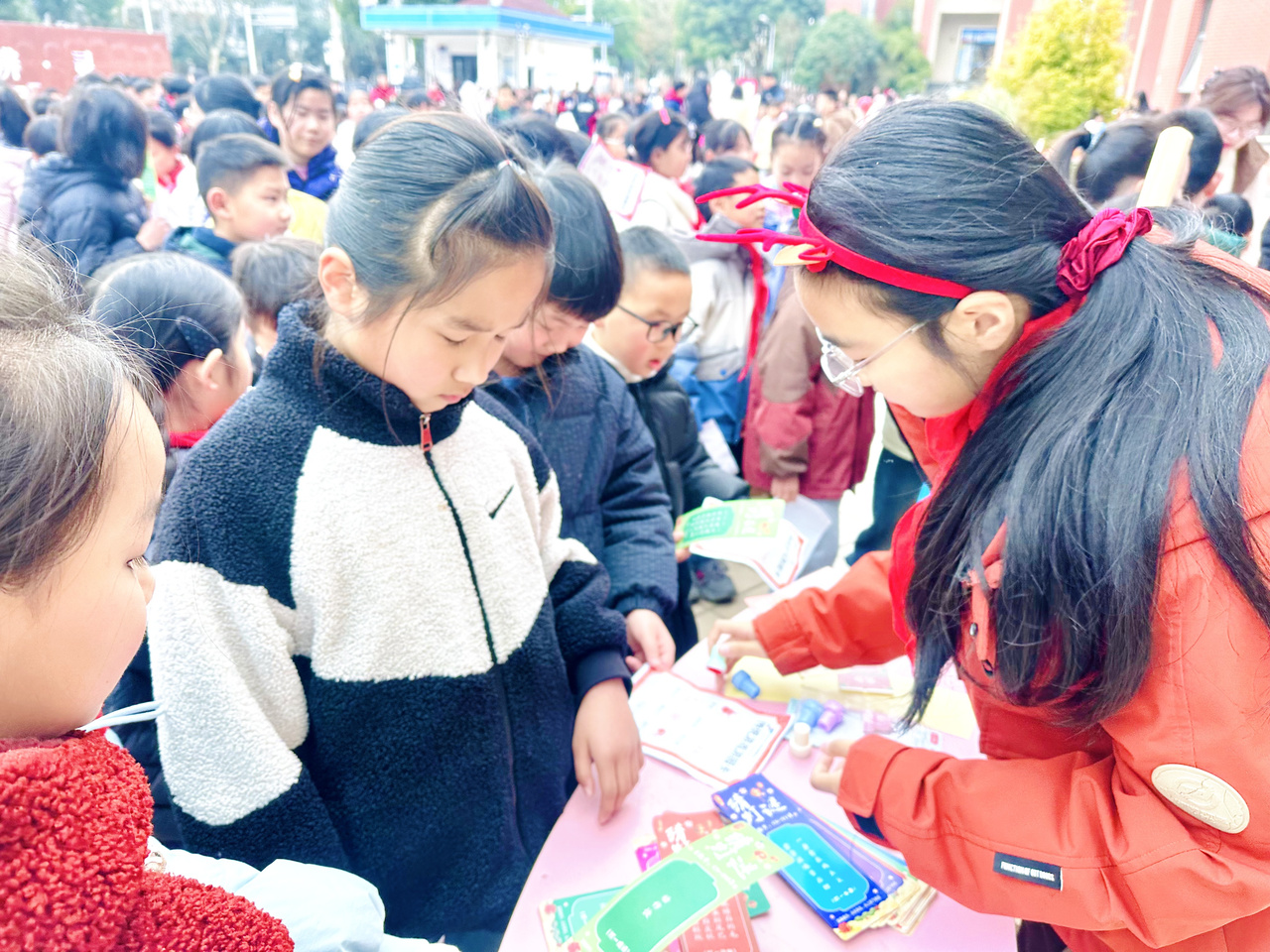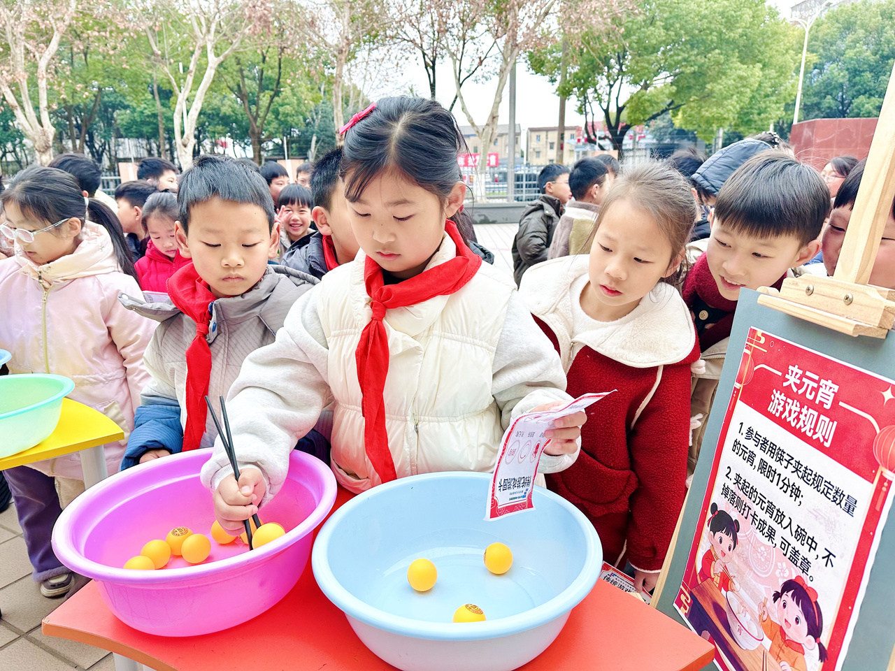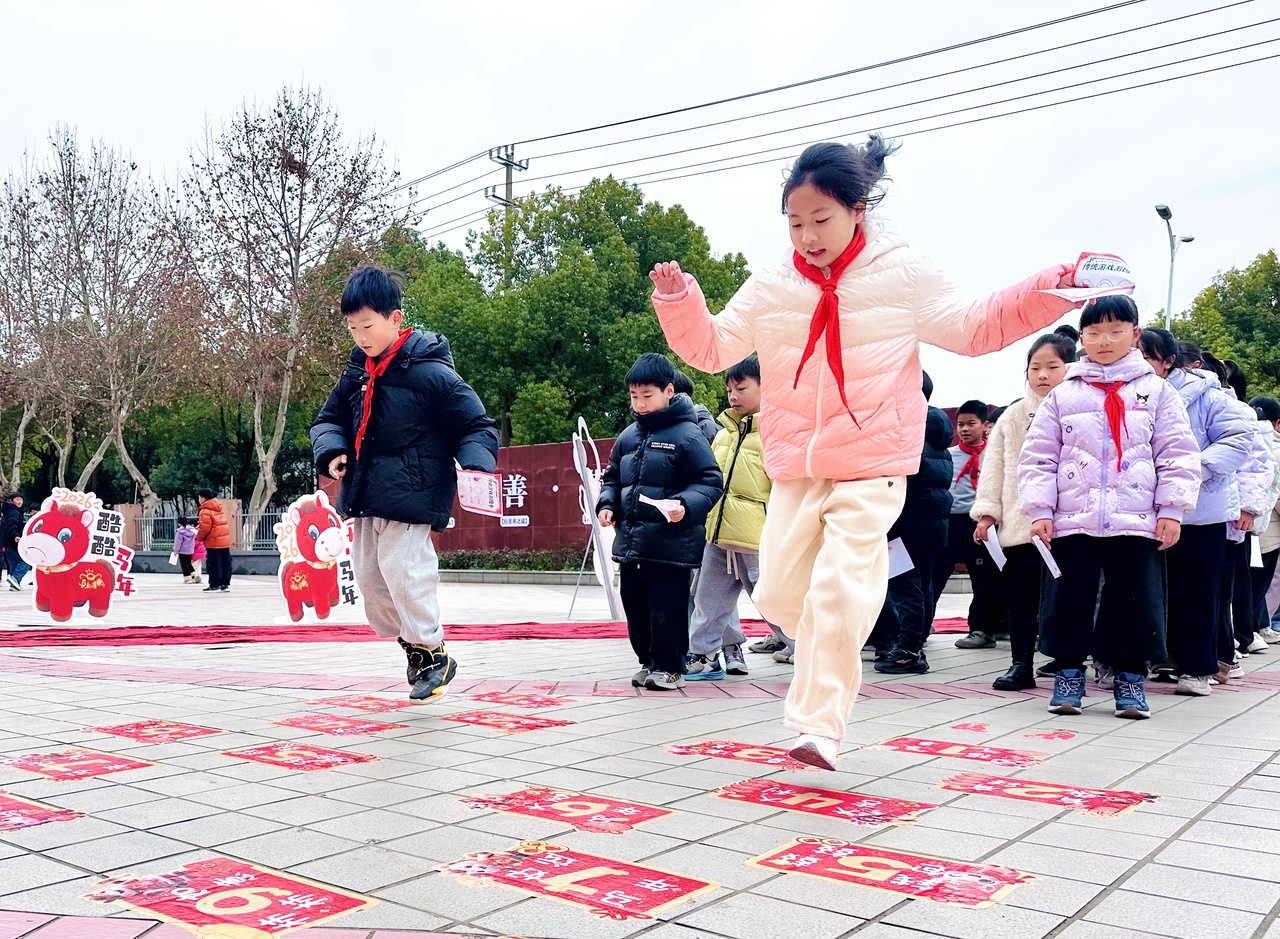 热闹的游园打卡活动将开学氛围推向高潮。“游园打卡,乐享成长” 环节设置了猜科技灯谜、滚铁环、筷子夹元宵、盲盒趣答、跳房子、投壶六大传统游园摊位,每个摊位前都有党员志愿者耐心引导,孩子们手持打卡卡片,兴致勃勃地穿梭于各个摊位之间。猜科技灯谜区,孩子们凝神思考,为解开一道科技谜题欢呼雀跃;筷子夹元宵区,大家屏息凝神,小心翼翼地夹起 “元宵”,体验传统游戏的乐趣;盲盒趣答区,科技与马年相关的趣味题目,让孩子们在答题中收获知识与惊喜。每完成一个打卡项目,孩子们就能收获一枚专属贴纸,集齐六枚贴纸后,还能到指定兑换点兑换火箭币,小小的激励让孩子们的参与热情更高,在趣味互动中传承中华传统文化,收获成长的快乐。